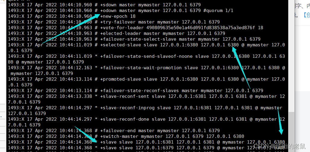 ?如图所示,主机挂掉之后,就会进行选择,选择6380端口的redis作为新的主机,原来的6379变成了6380的从机,至此搭建完成