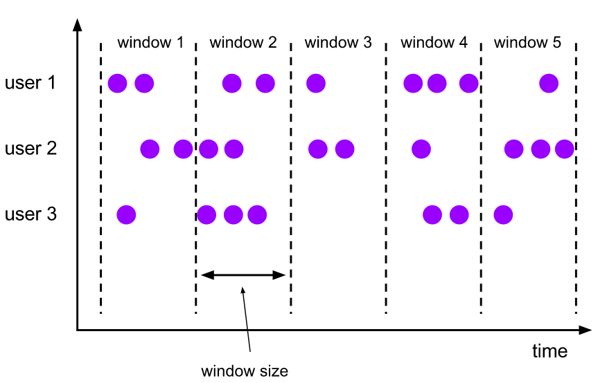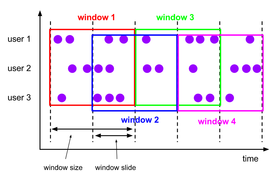 - 滑动时间窗口:窗口大小与滑动距离或相同或不同;