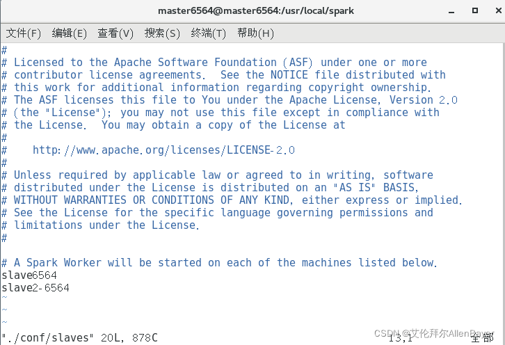 [root@master spark]# cp ./conf/slaves.template ./conf/slaves
