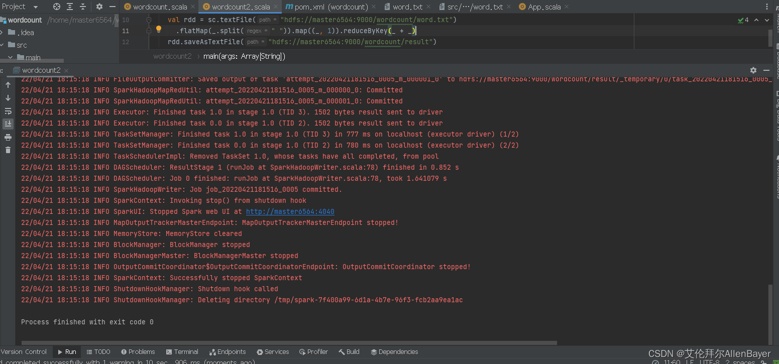 rdd.saveAsTextFile("hdfs://master6564:9000/wordcount/result")