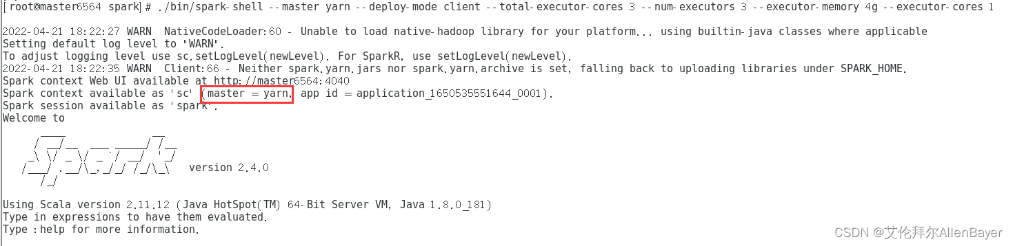 [root@master6564 spark]# ./bin/spark-shell --master yarn --deploy-mode client --total-executor-cores 3 --num-executors 3 --executor-memory 4g --executor-cores 1