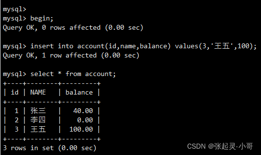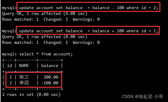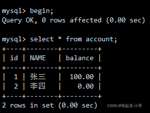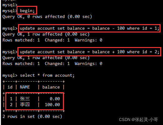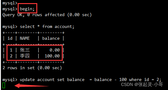 此时,我们来了一个需求,需要将张三账户中的100元钱转账给李四,下面这样做:👇👇👇? 我们在第一个连接中完成,首先begin显式的开启一个事务,两次update之后select可以看到转账成功了。但是此时第一个连接关于这个事务还没有进行commit提交。