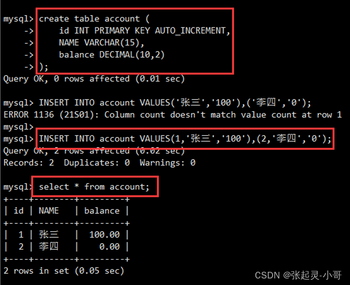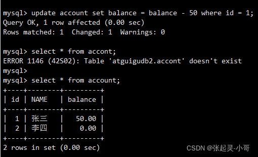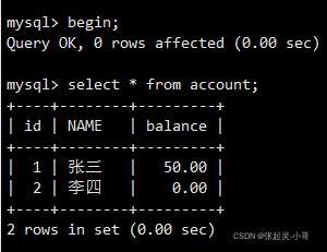 下面首先在第二个连接中 begin 开启一个事务,将张三的存款扣50元,那么此时在当前连接中肯定是可以select到正确的数据(张三50、李四0)。