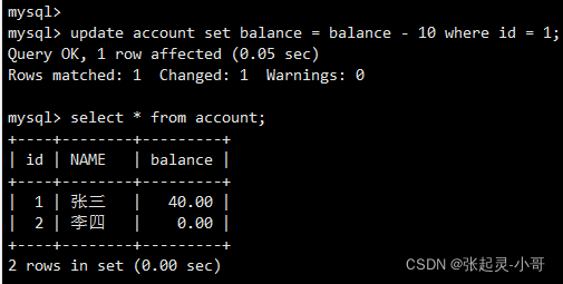 下面,我们在第二个连接中将事务提交,再次读取,此时两个连接事务均已结束,所以肯定都会读取到正确数据了(张三40、李四0)。