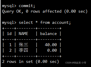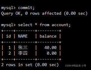 然后我们在第一个连接中将事务提交,那么第一个连接中再次读取肯定还是正确数据(张三40、李四0)。