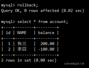 这其实就是因为在第一个连接中进行了rollback回滚(张三100、李四0),此时这个数据在读未提交情况下是可以被第二个连接读到的,在此基础上,两次update导致李四又被扣了100,张三又多了100,所以李四0-100 = -100? 张三 100 + 100 = 200。 (也即读未提交情况下存在脏读问题)