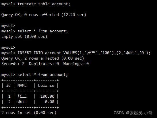 首先将上面的account表中数据清空,仍然向表中插入与上面案例相同的两条数据(张三100、李四0),进行下面的读已提交举例。
