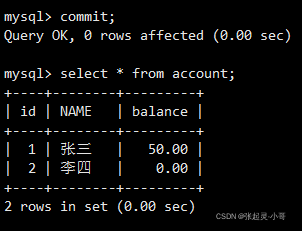 下面的实例表明:读取到的还是和第一次一样(张三50、李四0),这就达到了可重复读的要求,也就是事务A在读到一条数据之后,此时事务B对该数据进行了修改并提交,那么事务A再读该数据,读到的还是原来的内容。
