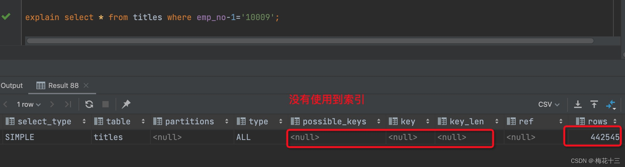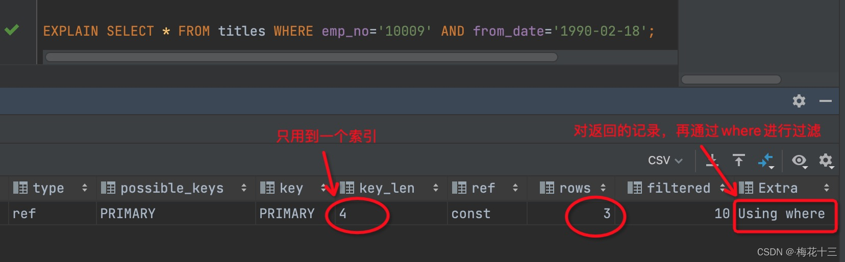 解析:title未提供,故查询只用到索引的第一列<emp_no>?,emp_no='10009' 的数据预估有3行,后面的from_date虽然也在索引中,但由于title不存在而无法和左前缀连接,因此需要对结果进行扫描过滤from_date。