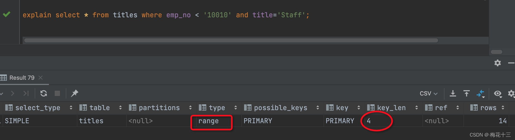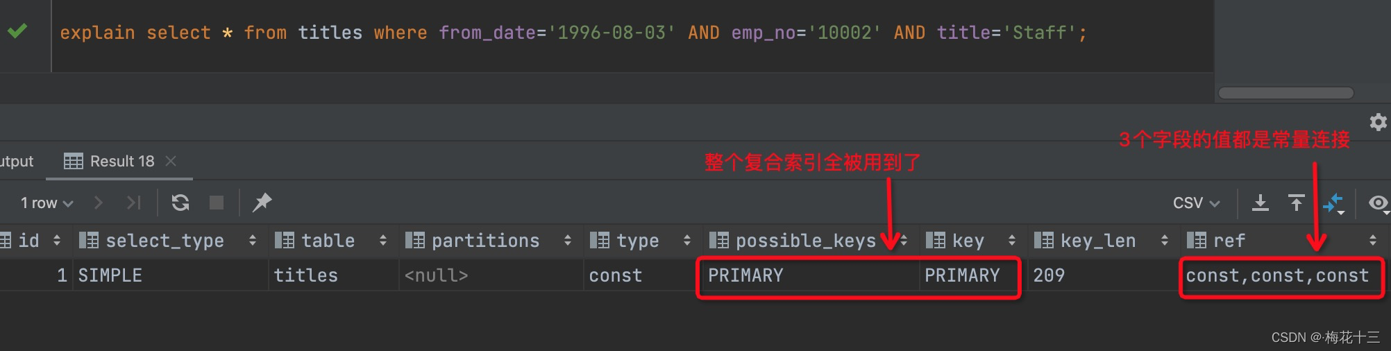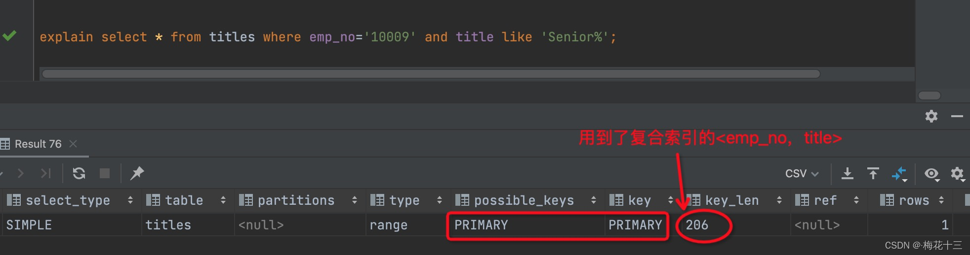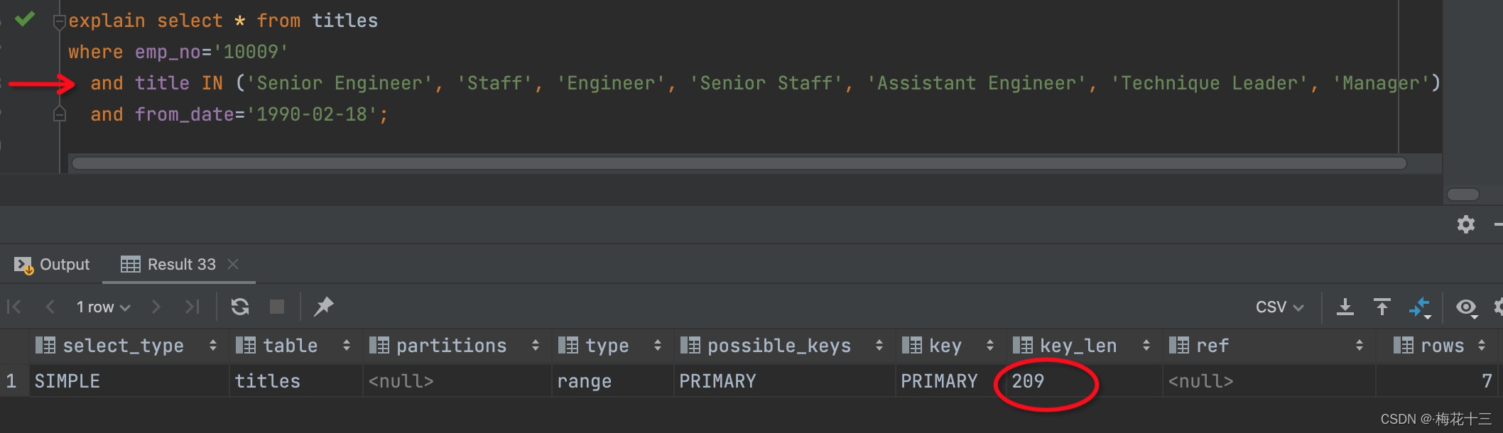 解析:根据上图可知,使用到了primary主键索引,key_len索引长度为209,由此可见,整个复合索引 <emp_no,title,from_date>的字段列都匹配到了。