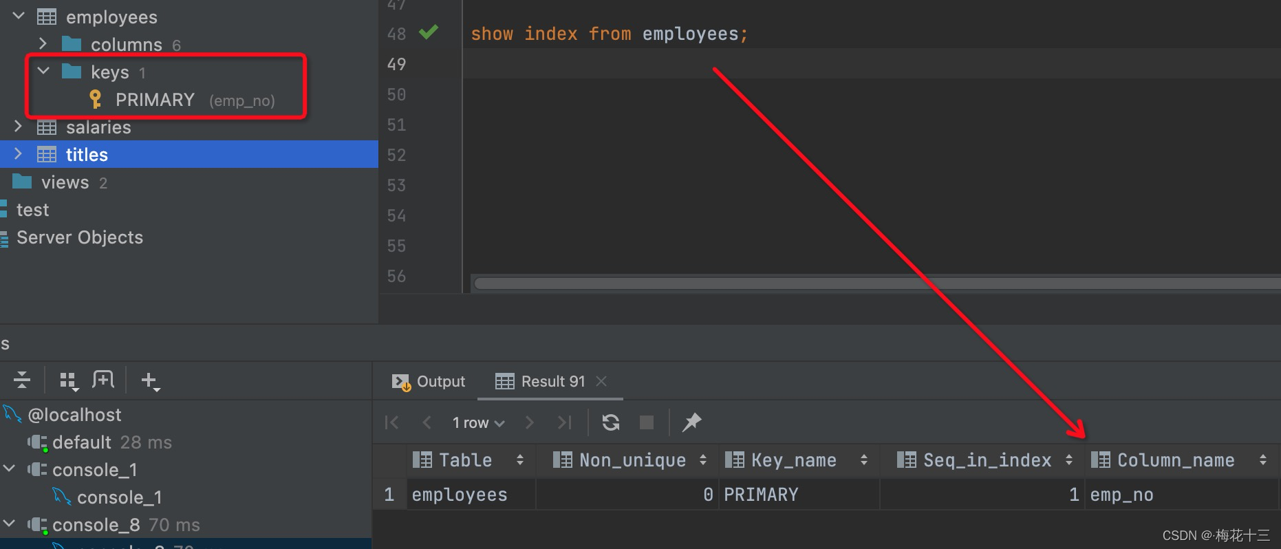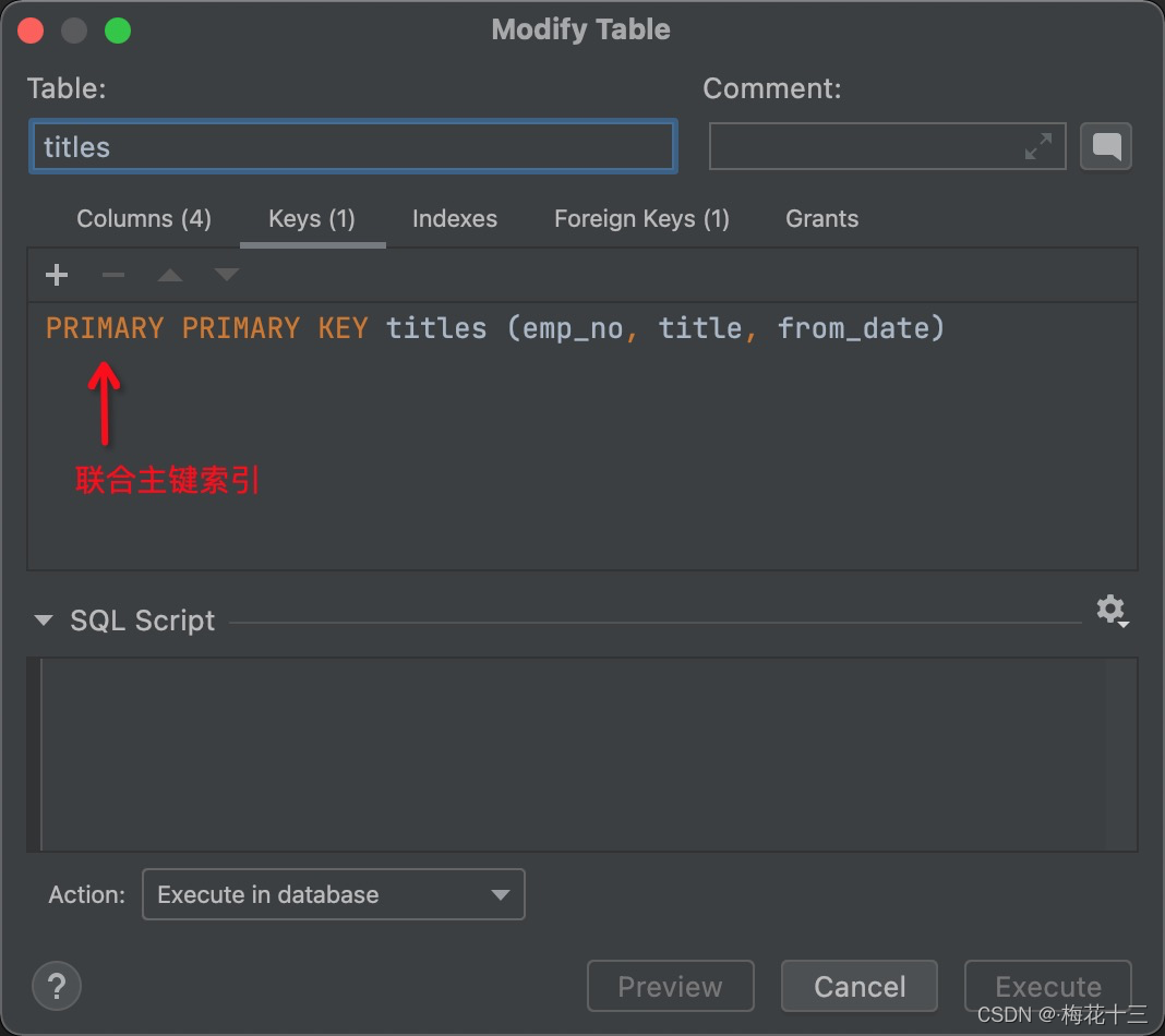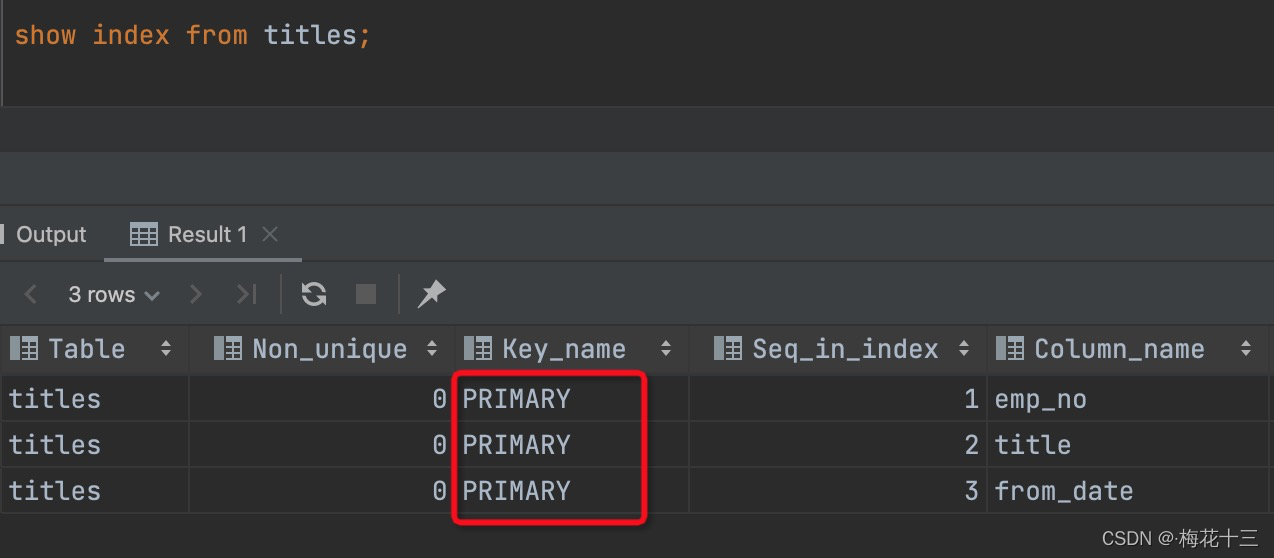 由图可知,titles表中有一个复合主键索引,分别由字段emp_no、title、?from_date组成一个主键。