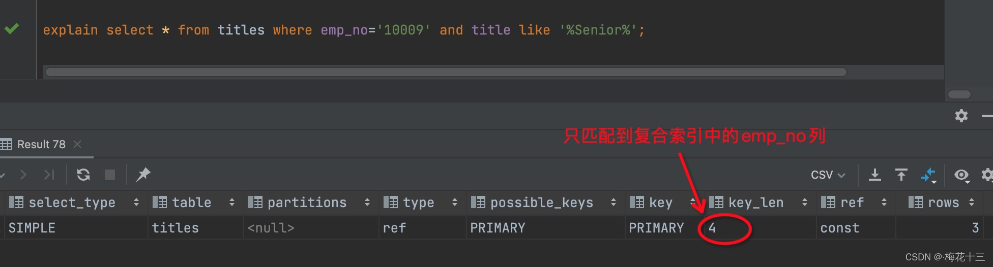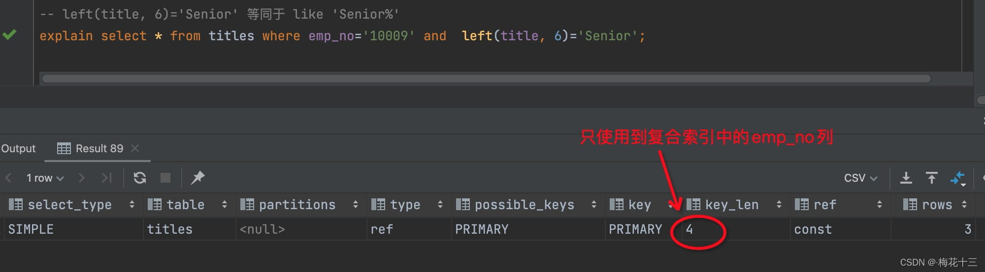 在复合索引里的title列,使用前缀匹配 like ‘Senior’;而不是完全匹配模式