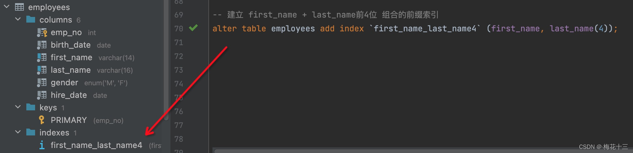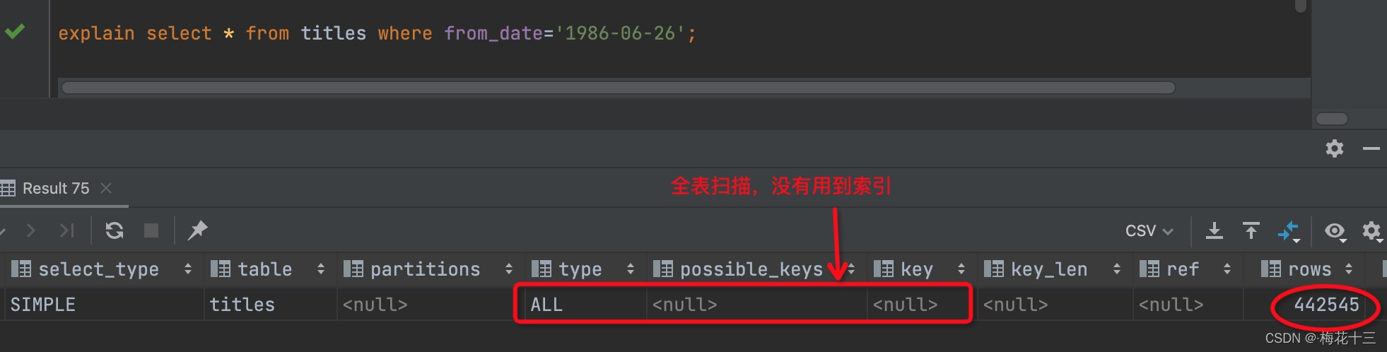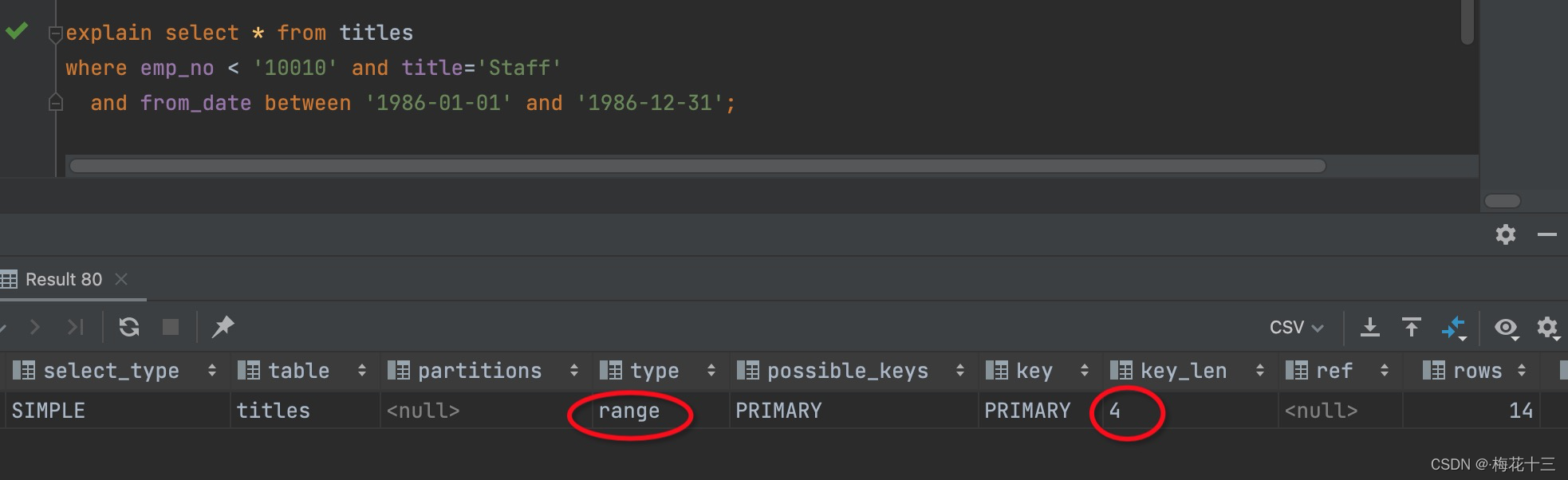由上述得出,titles表存在一个复合索引,即:<emp_no,title,from_date>