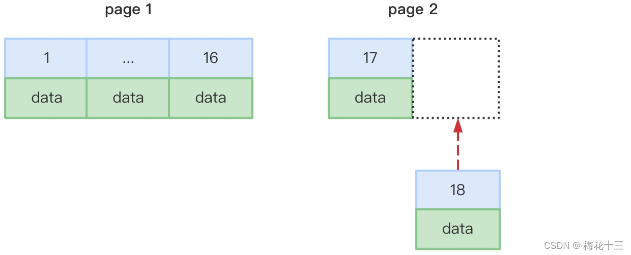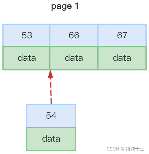 每次插入新记录,会顺序添加到当前索引节点的后续位置,形成一个紧凑的索引结构,当一页写满,就会自动开辟一个新的页。插入时也无需移动已有数据,因此效率很高。例如: