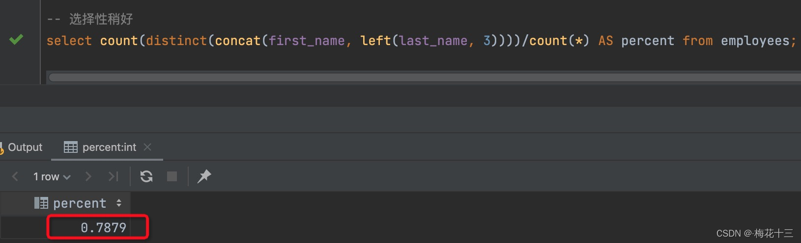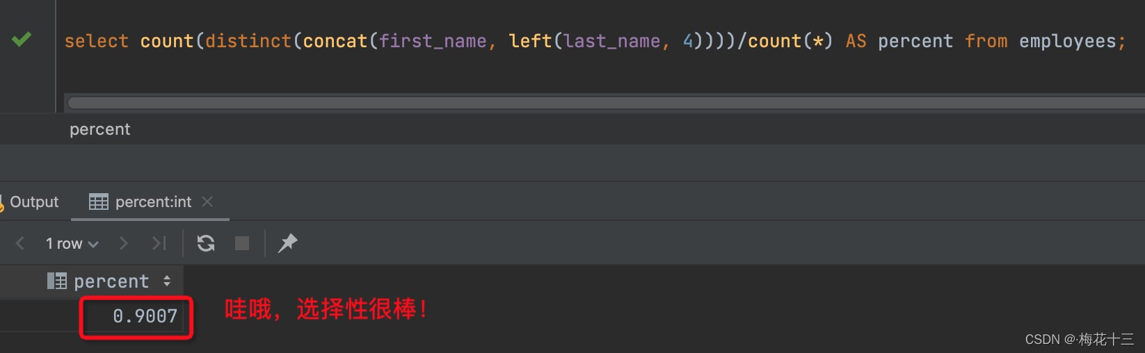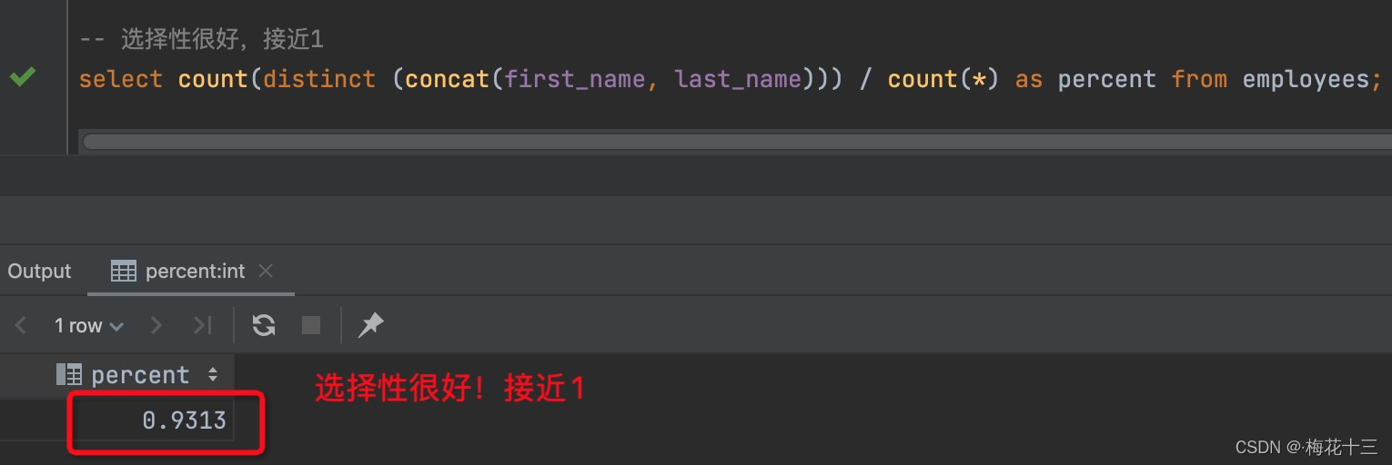 选择性的取值范围为(0, 1),选择性越高的索引价值越大,比例越大我们扫描的记录数越少,唯一键的区分度是1,而一些状态、性别字段可能在大数据面前区分度就是0,