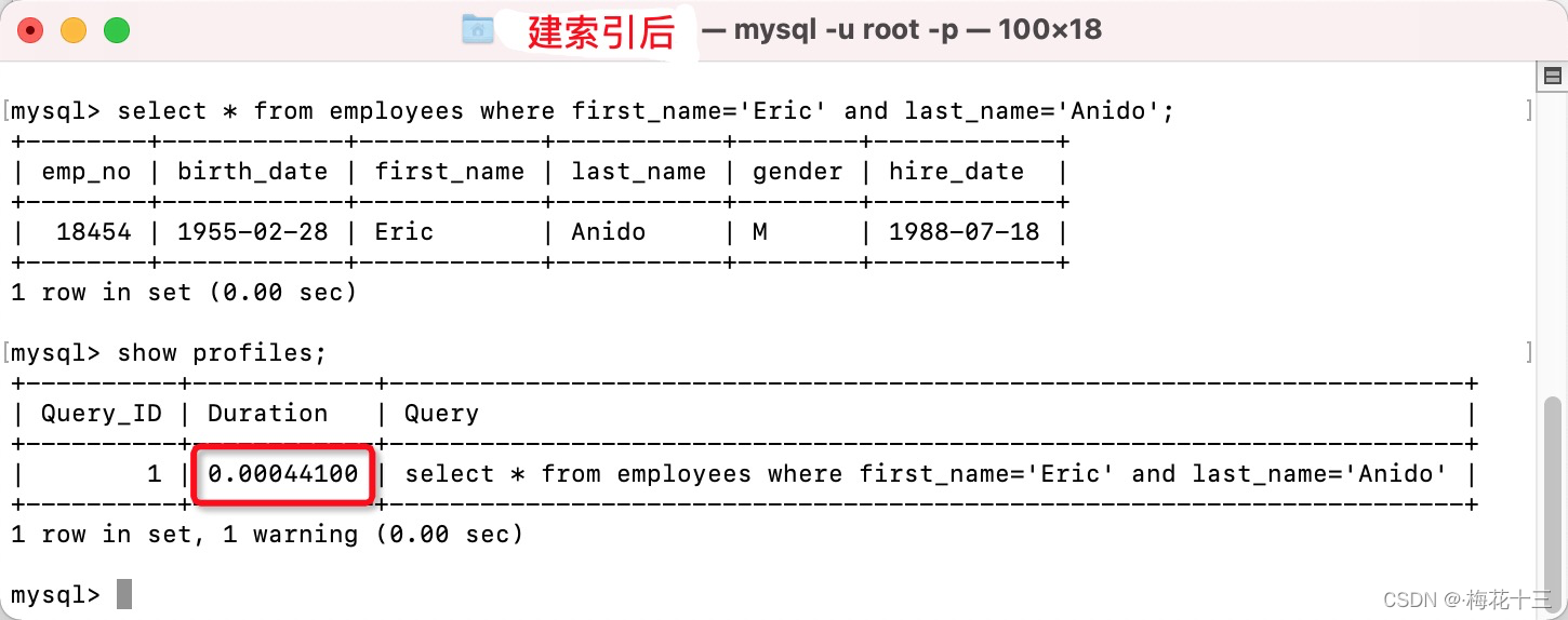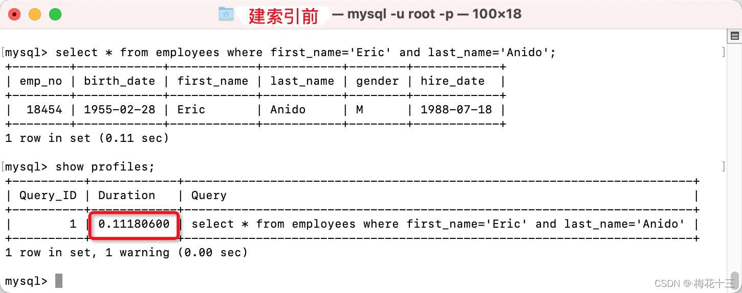 ? 对比查询:此时再执行一遍按名字查询,比较分析一下与建索引前的结果