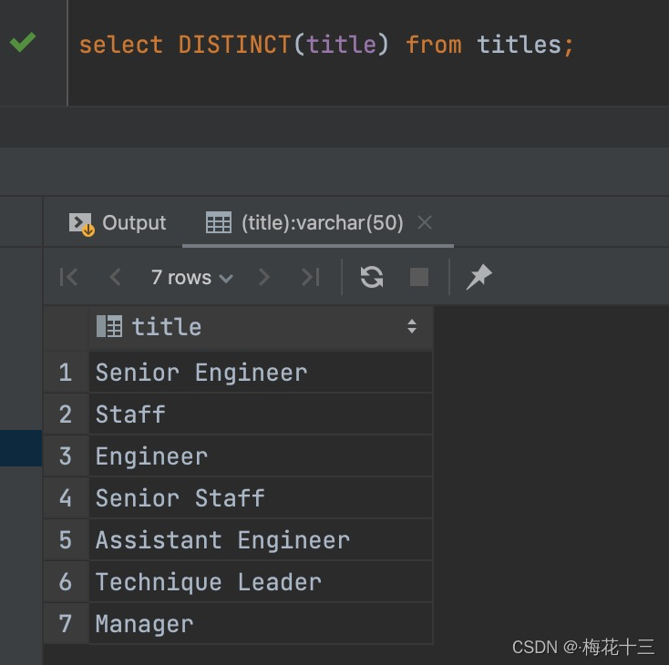 (?a, b, c)?中有两个字段,但未出现?b,按照左前缀原则就断开了,所以只能使用到?a,c,b?或者?c,a,b?等,不影响结果,跟出现的字段有关?我们拿官方提供的employees数据库中的titles表做演示效果,查看其表结构,如下: