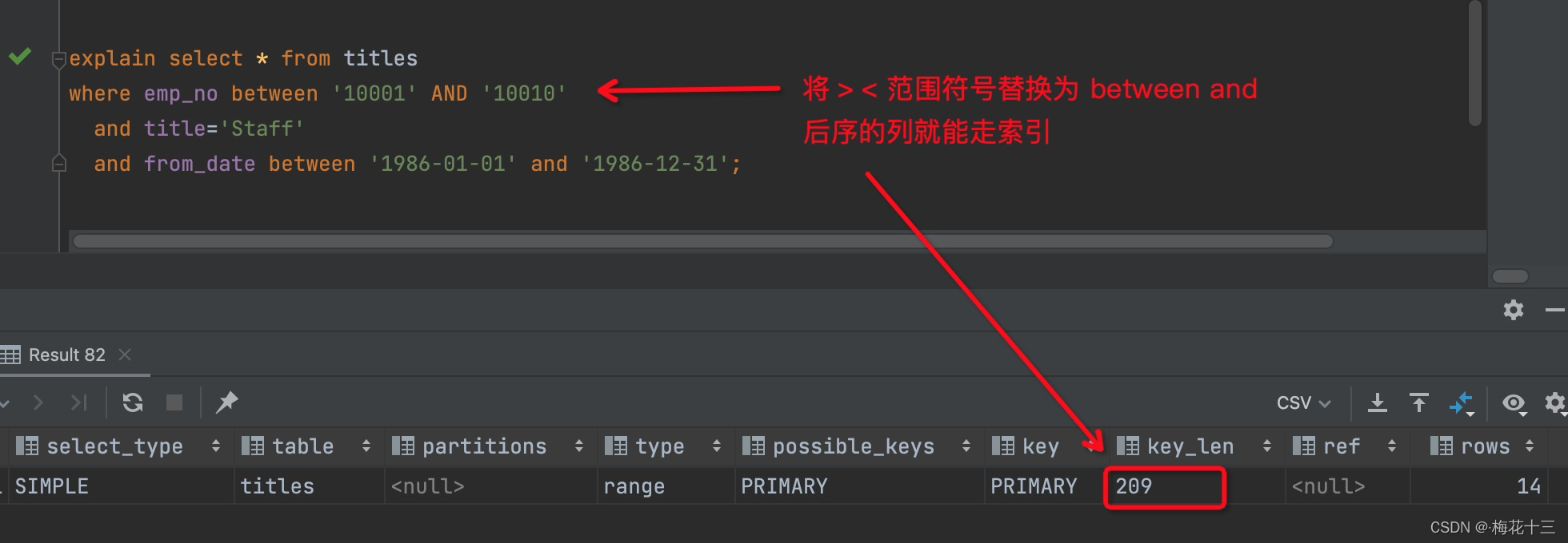 注意②:仅用explain可能无法区分范围索引和多值匹配,因为在type中这两者都显示为range。同时,用了“between”并不意味着就是范围查询,例如下面的查询: