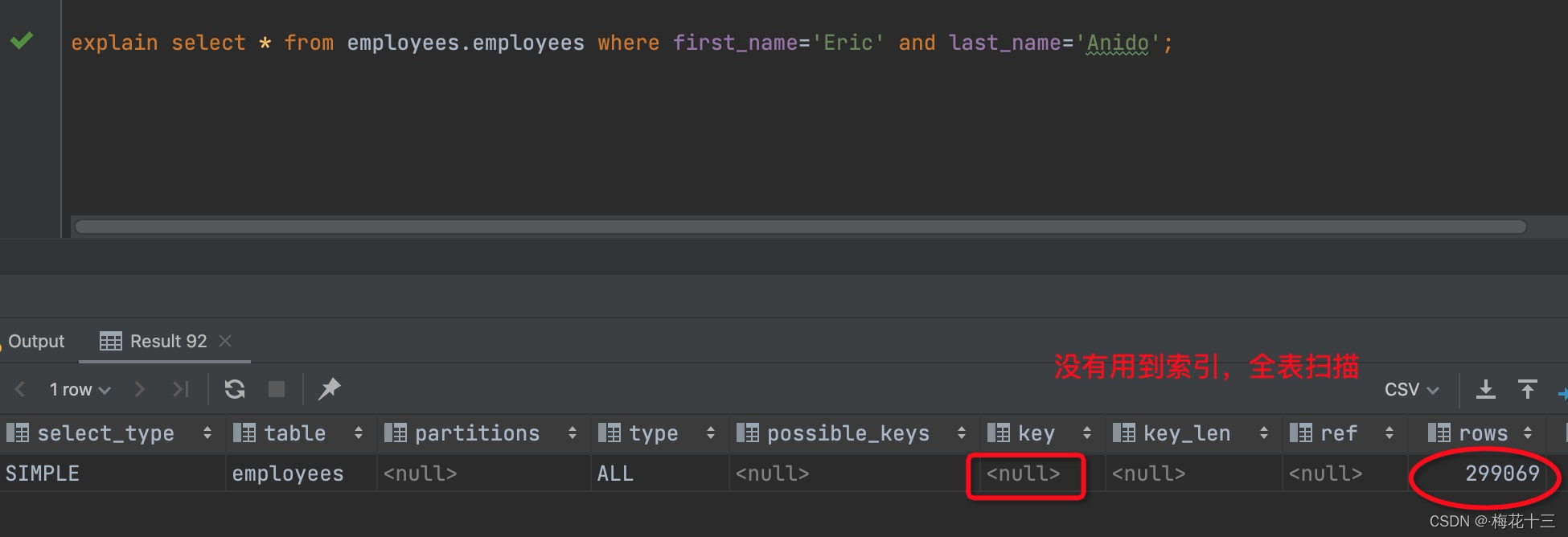 employees表只有一个主键索引<emp_no>,如果按名字搜索一个人,就只能走全表扫描,如下