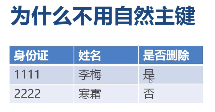 ? 自然主键与代理主键 1. 自然主键是指事务属性中的自然唯一标识 2. 代理主键是指与业务无关的,无意义的数字序列值 3. 在设计时,优先推进代理主键,不推进自然主键