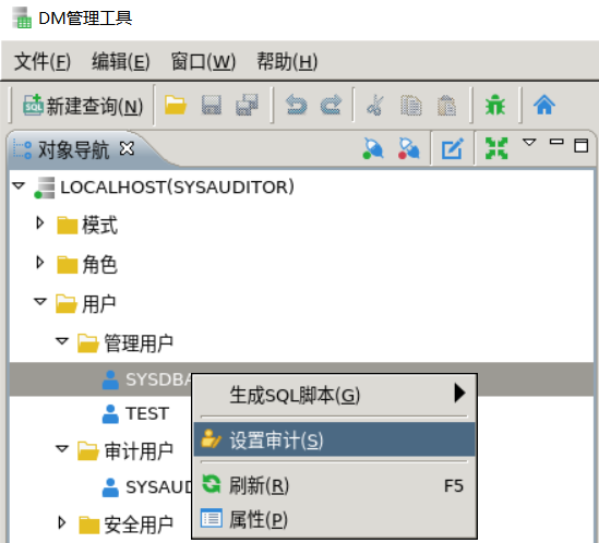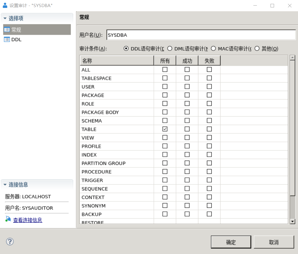 二、设置审计2.1语句级审计语句级审计的动作是全局的,不对应具体的数据库对象。 例1:审计SYSDBA用户对表的创建、修改和删除 DM管理工具设置: