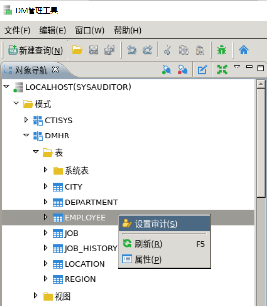 2.2对象级审计对象级审计发生在具体的对象上,需要指定模式名以及对象名。 例2:对SYSDBA用户,对表DMHR.EMPLOYEE表进行的修改和删除的操作进行审计。 DM管理工具设置: