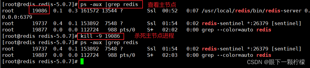 查看并杀死master节点的redis-server  再次查看哨兵信息