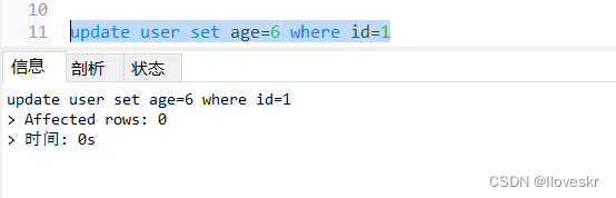 成功了;说明加锁数据只是针对id=1的,其它的数据可以照常更新。 下面不使用id作为唯一主键去更新,成功了就锁行,不成功就是锁表。 实例二 使用age普通字段操作: