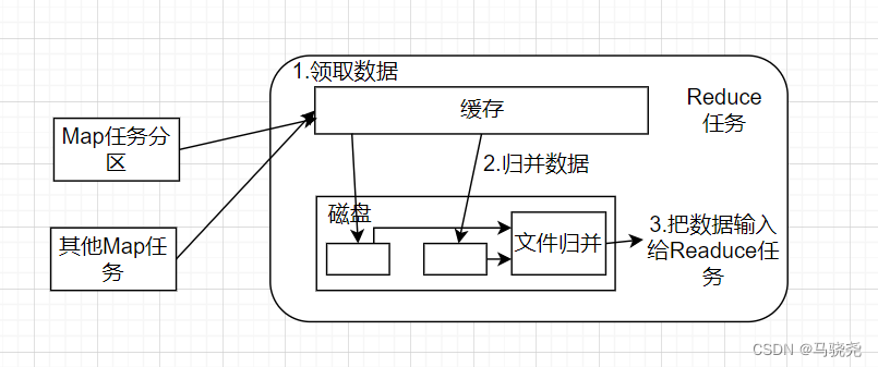 ?(1)领取数据:每个Reduce任务会不断地通过RPC向JobTracker询问Map任务是否以及完成,若JobTracker检测到Map任务完成就好通知Reduce任务领取属于自己的分区数据到本地磁盘 (2)归并数据:将数据写的Reduce任务的缓存中,缓存过连也会溢写到磁盘,然后对数据进行排序,归并,再传输带Reduce任务 (3)把数据写到Reduce任务:执行Reduce函数中的各种映射,输出最终结果,并将结果保持到分布式文件系统中(比如HDFS或GFS) |