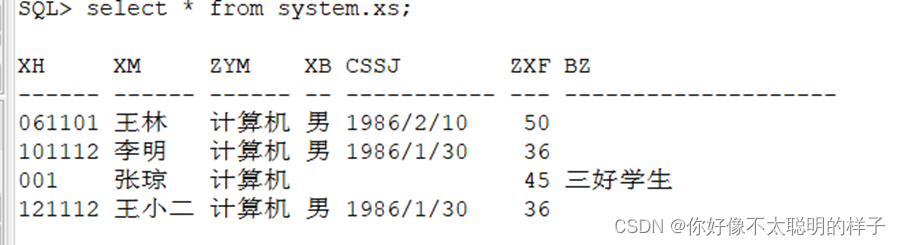 ? 6.模拟merge的操作实现declare --声明变量 v_xm varchar2(8):='ikun'; v_zym varchar2(10):='练习生'; v_zxf number(2):=25; begin ? --找得到更新 ? update system.xs set zxf=v_zxf where xm=v_xm; ? --找不到插入 ? if SQL %NOTFOUND then ??? dbms_output.put_line('没有这个同学需要插入这个同学。'); ??? insert into system.xs(xh,xm,zym,zxf) values ('007',v_xm,v_zym,v_zxf); ??? end if; end; / 结果显示: