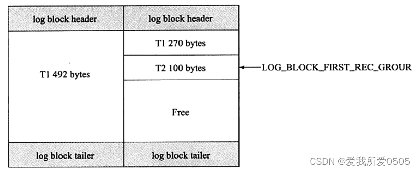 ????????注意:其中LOG_BLOCK_FIRST_REC_GROUP表示块中第一个事务开始位置的日志偏移量, 如下图所示。