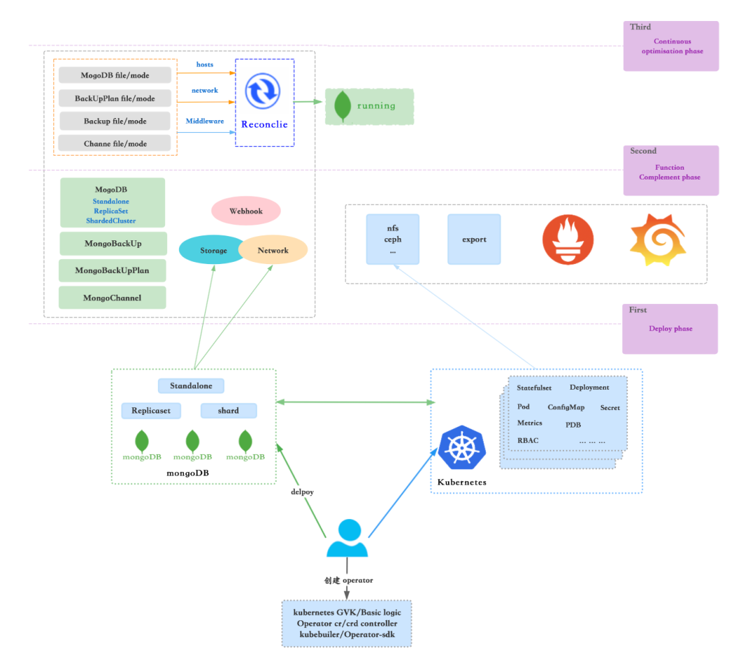 Operator 部署阶段:作为开发者,确定了 mongo 相关的需求之后,首先要熟悉 mongo 的使用方式和基本知识,掌握 Kubernetes、Operator CRD/Controller Kubebuiler/operator-sdk 等技术,才能创建 mongo operator 项目; -