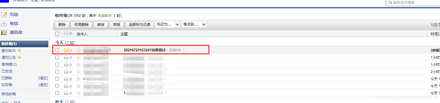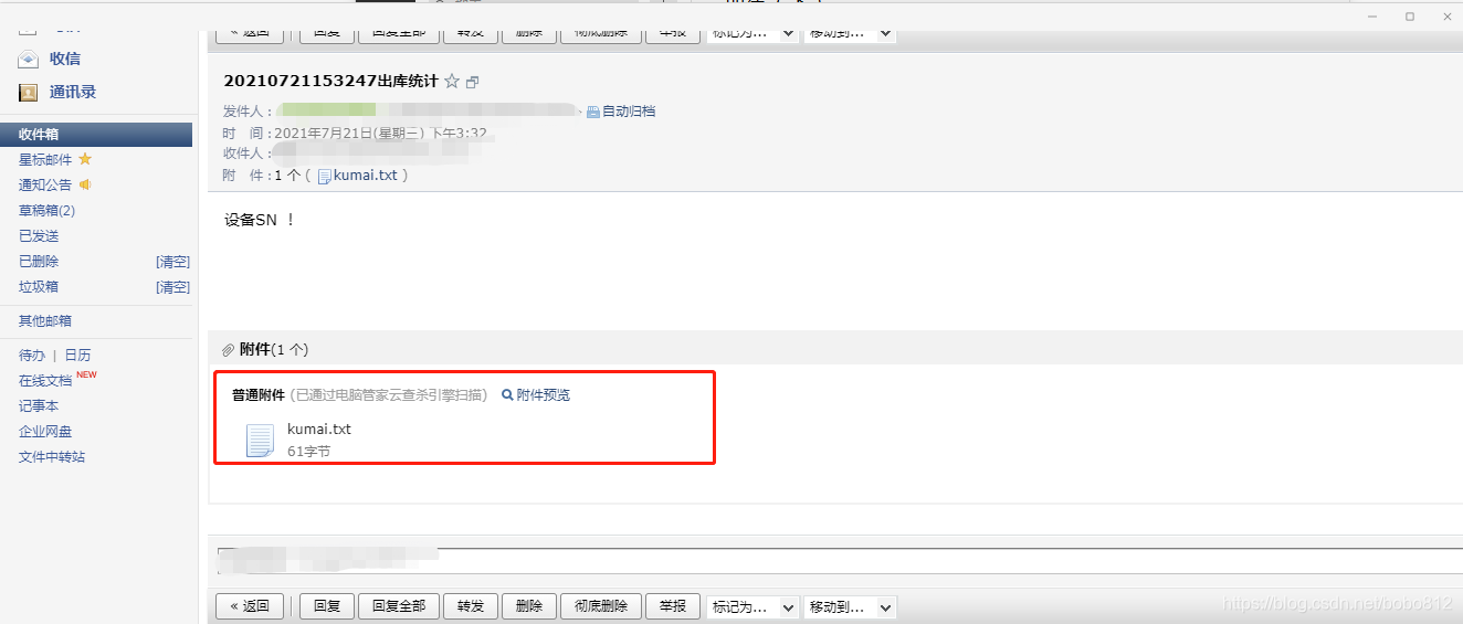 case R.id.send: ? ??? new Thread(new Runnable() { ??????? @Override ??????? public void run() { ??????????? try { ??????????????? EmailSender sender = new EmailSender(); ??????????????? //设置服务器地址和端口 ??????????????? sender.setProperties("smtp.163.com", "25"); ??????????????? //分别设置发件人,邮件标题和文本内容 ??????????????? sender.setMessage("******@163.com", Util.getCurDateTime()+"出库统计", "设备SN !"); ??????????????? //设置收件人 ??????????????? sender.setReceiver(new String[]{"******@126.com"}); ??????????????? //添加附件 ??????????????? //这个附件的路径是我手机里的啊,需要更换成你手机里自己的路径 ??????????????? sender.addAttachment( Environment.getExternalStorageDirectory() ??????????????????????? .getAbsolutePath()+ "/sendemail" + "/" +"kumai.txt"); ?? ??? ??? ??? ??? ??? ? ?? ??? ??? ??? ?//下面是重点 否则程序会报 ?? ??? ??? ??? ?//javax.activation.UnsupportedDataTypeException: no object DCH for MIME type multipart ?? ??? ??? ??? ?//以下代码 在执行sendEmail前加上如下代码就行! ?? ??? ??? ??? ??? ??? ?? ??????????????? // add handlers for main MIME types ??????????????? MailcapCommandMap mc = (MailcapCommandMap) CommandMap.getDefaultCommandMap(); ??????????????? mc.addMailcap("text/html;; x-java-content-handler=com.sun.mail.handlers.text_html"); ??????????????? mc.addMailcap("text/xml;; x-java-content-handler=com.sun.mail.handlers.text_xml"); ??????????????? mc.addMailcap("text/plain;; x-java-content-handler=com.sun.mail.handlers.text_plain"); ??????????????? mc.addMailcap("multipart/*;; x-java-content-handler=com.sun.mail.handlers.multipart_mixed"); ??????????????? mc.addMailcap("message/rfc822;; x-java-content-handler=com.sun.mail.handlers.message_rfc822"); ??????????????? CommandMap.setDefaultCommandMap(mc); ?? ??? ??? ??? ? //以下需要注意,下面又是一个大坑,很多说是填写你发件人邮箱的密码,其实不是 这里需要填的是邮箱授权码 ?? ??? ??? ??? ? // 否则程序会报 javax.mail.AuthenticationFailedException