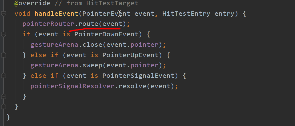 如上代码所示, GestureBinding 的 _handlePointerEvent 方法中主要是 hitTest 和 dispatchEvent: 通过 hitTest 碰撞,得到一个包含控件的待处理成员列表 HitTestResult,然后通过 dispatchEvent 分发事件并产生竞争,得到胜利者相应。