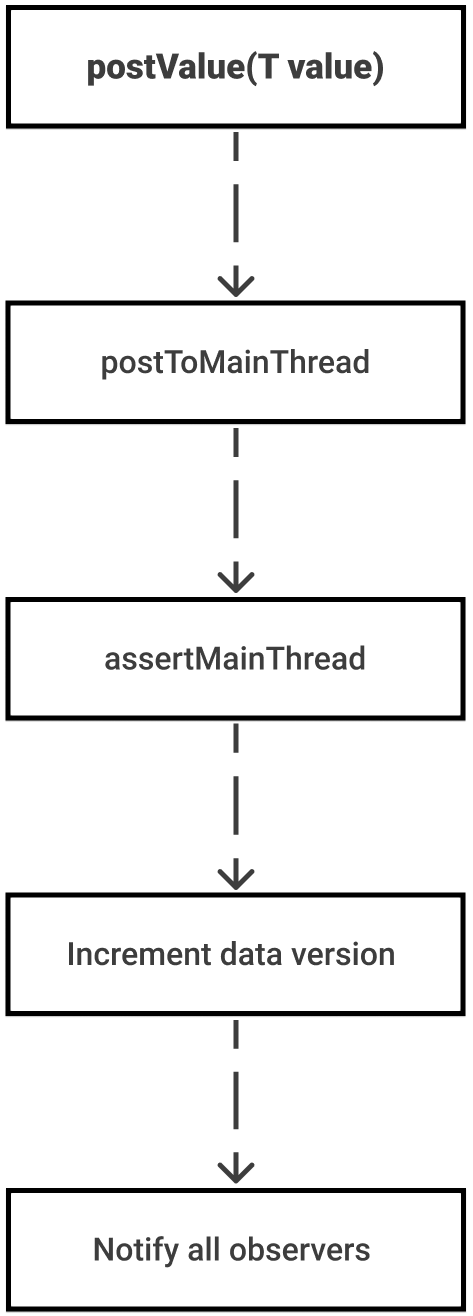 关于LiveData只能在主线程更新数据,有的同学可能要问,不是有postValue吗?其实postValue也是需要切换到到主线程的,如下图所示: