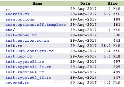 ?这里能看到init.rc还有zygote32和64位的单独版本,分别对应32位和64位系统。还有init.zygote32_64.rc,代表会启动两个进程,主进程是32。