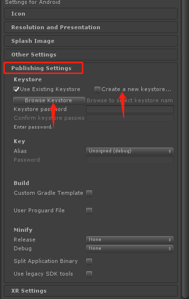 当然了,如果你是正儿八经要发布到应用商店,还需要加签名。可以在刚才Player Settings打开的窗口,找到Publishing Settings,添加key。如果没有key,也可以重新创建一个。因为比较简单,不做展开了。