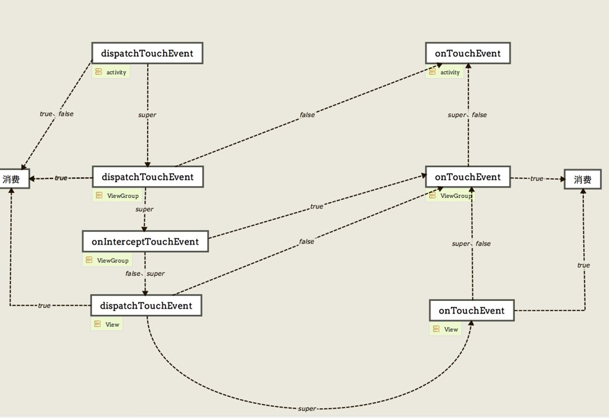 消费事件的总结:在哪个View的onTouchEvent 返回true,那么ACTION_MOVE和ACTION_UP的事件从上往下传到这个View后就不再往下传递了,而直接传给自己的onTouchEvent 并结束本次事件传递过程。