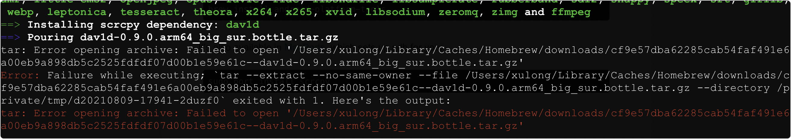 ==> Installing scrcpy dependency: dav1d ==> Pouring dav1d-0.9.0.arm64_big_sur.bottle.tar.gz tar: Error opening archive: Failed to open '/Users/xulong/Library/Caches/Homebrew/downloads/cf9e57dba62285cab54faf491e6a00eb9a898db5c2525fdfdf07d00b1e59e61c--dav1d-0.9.0.arm64_big_sur.bottle.tar.gz' Error: Failure while executing; `tar --extract --no-same-owner --file /Users/xulong/Library/Caches/Homebrew/downloads/cf9e57dba62285cab54faf491e6a00eb9a898db5c2525fdfdf07d00b1e59e61c--dav1d-0.9.0.arm64_big_sur.bottle.tar.gz --directory /private/tmp/d20210809-17941-2duzf0` exited with 1. Here's the output: tar: Error opening archive: Failed to open '/Users/xulong/Library/Caches/Homebrew/downloads/cf9e57dba62285cab54faf491e6a00eb9a898db5c2525fdfdf07d00b1e59e61c--dav1d-0.9.0.arm64_big_sur.bottle.tar.gz' 这是因为brew?在下载时可能依赖存的临时文件名,和安装时的脚本调用时文件名不一致。可以找一下当前下载的文件,把它名字改成安装调用时需要的名字即可。