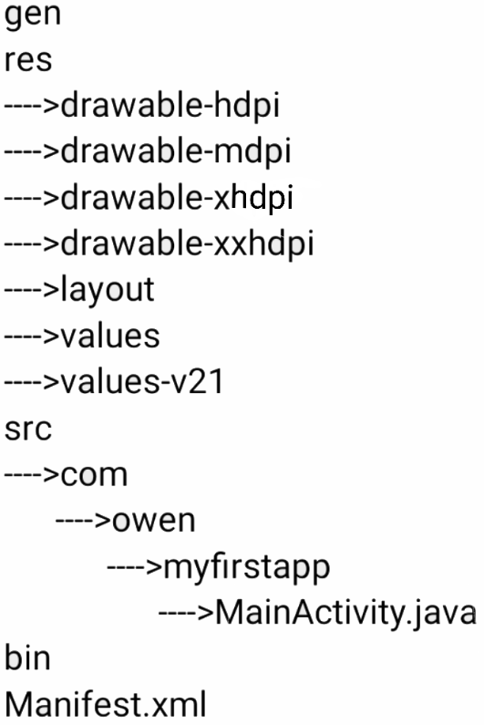 - res文件夹下又有很多文件夹,这里我们简单的进行说明:首先是四个drawable-…dpi这样的文件夹,我们的很多资源文件都会放在这下面,mdpi,hdpi,xhdpi和xxhdpi分别代表中分辨率(英语Medium的首字母),高分辨率(英语High的首字母),超高分辨率,超超高分辨率。然后是layout文件夹,这个里面放的是应用的布局文件,稍后会解释。最后是values文件夹,这个里面也是用来放资源文件的。