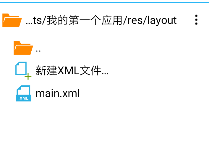 首先点击右下角的那个蓝色圆盘,你会看到这样的一个界面   这里我简单说明一下:AIDE可以实现简单的文件操作。下图中,点击红色箭头指向的那三个点之后,你就可以在当前目录下创建新的文件或者目录;点击橙色的箭头指向的那两个点之后,你就可以退回到上一级目录。这里我已经退回到我们这个应用的第一级目录了。