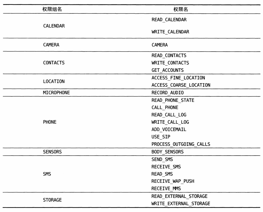 Android权限分为普通权限和危险权限 对于普通权限,一般系统会自动帮我们授权,但对于危险权限需要用户手动授权。 下面是Android中所有的危险权限: 其他表中没有列出的权限就全都是普通权限。 Android中系统完整的权限列表:http://developer.android.com/reference/android/Manifest.permission.html