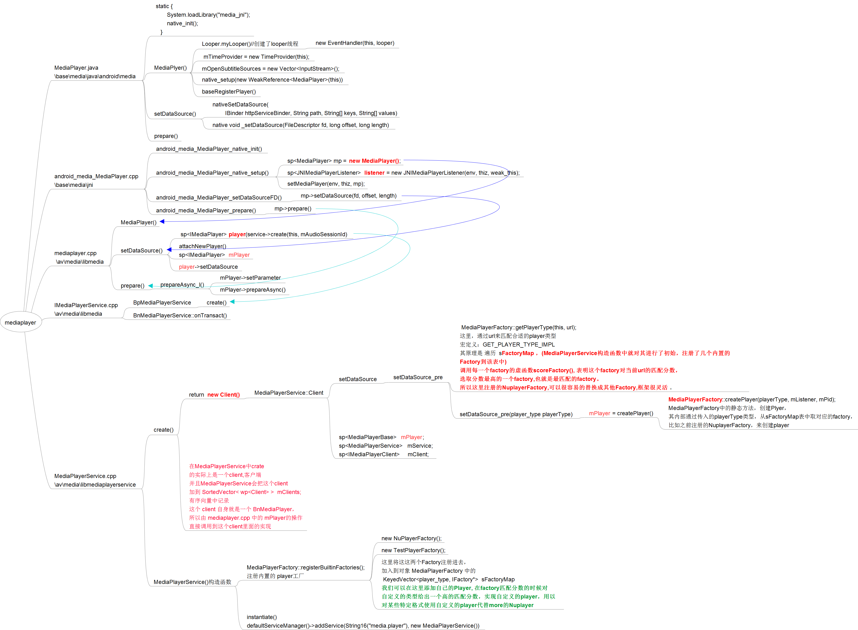?T1:player 耦合点 --MediaPlayerFactory::getPlayerType(this, url);? 这里,通过url来匹配合适的player类型 宏定义:GET_PLAYER_TYPE_IMPL? 其原理是 遍历??sFactoryMap ,(MediaPlayerService构造函数中就对其进行了初始化,注册了几个内置的Factory到该表中,目前只有一个Nuplayer可注册)? 调用每一个factory的虚函数scoreFactory(), 表明这个factory对当前url的匹配分数,? 选取分数最高的一个factory,也就是最匹配的factory。? 所以这里注册的NuplayerFactory,可以很容易的替换成其他Factory,框架很灵活,哪一天google对这个Nuplayer不满意了,可能就再整一个新的player在这里注册进去。 T2:主要文件 ? ??------MediaPlayer.java?? \base\media\java\android\media java的class ? ? ------android_media_MediaPlayer.cpp??\base\media\jni? ?java 对应的jni转 ? ??------mediaplayer.cpp??\av\media\libmedia? 没什么实在作用,一层包装 ? ? ------IMediaPlayerService.cpp? \av\media\libmedia android典型的 binder 实现的服务,Bp+Bn,跨进程的方法调用,弱化进程概念,代之以组件的思想? ? ? ------MediaPlayerService.cpp???\av\media\libmediaplayerservice Bn,真正的MediaPlayer工作的地方 ? ? ------main_mediaserver.cpp??av\media\mediaserver? 这里有main入口函数,这个会生成可执行程序mediaserver,列在系统的启动脚本.rc文件中,系统启动的时候会调用该可执行程序,把mediaPlayerserver服务启动起来。 ? ?