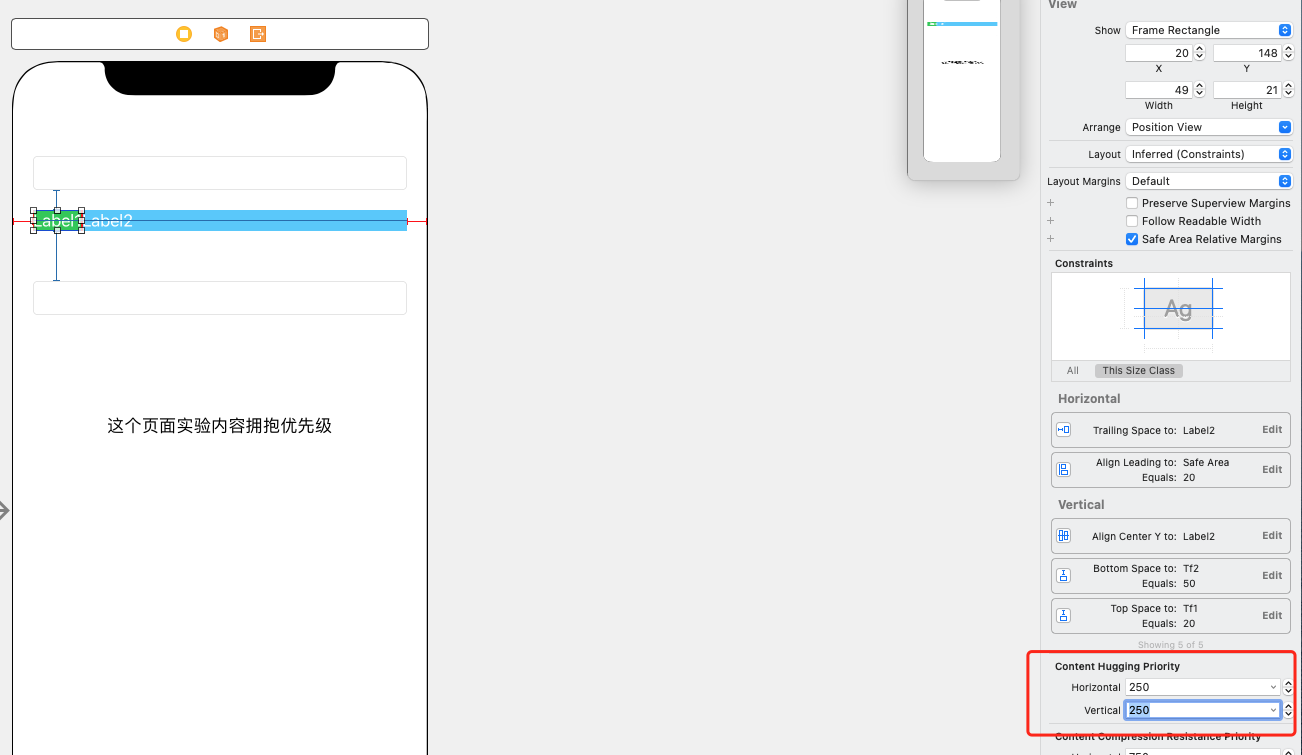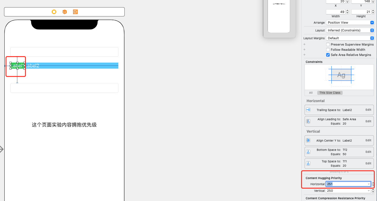 我们修改label的优先级,提高,把默认的250改成251,这样,label1的内容优先级高,label1就会挤压lable2