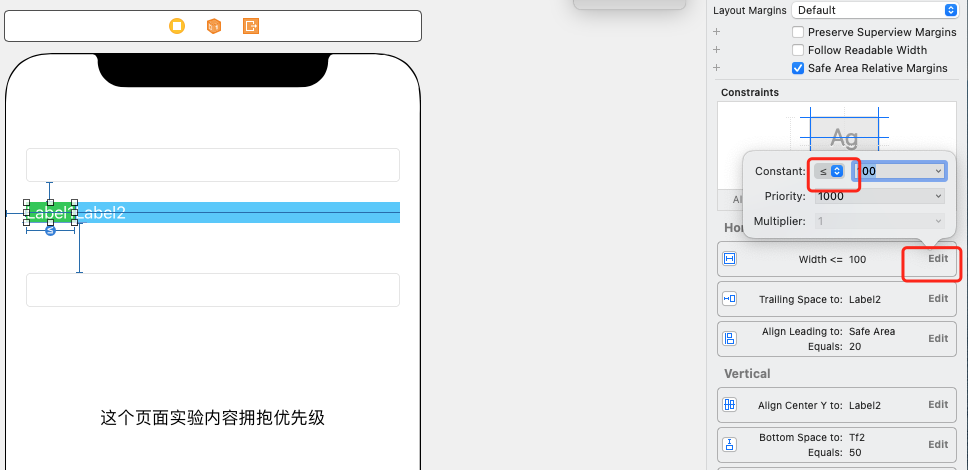 只要在label上面添加一个宽度<= 100就可以了 先把添加label的宽度为100  然后把宽度100的约束改成 <= 100 如下图,点击 witdth 100右边的 edit ,然后constant 右边选择 <=