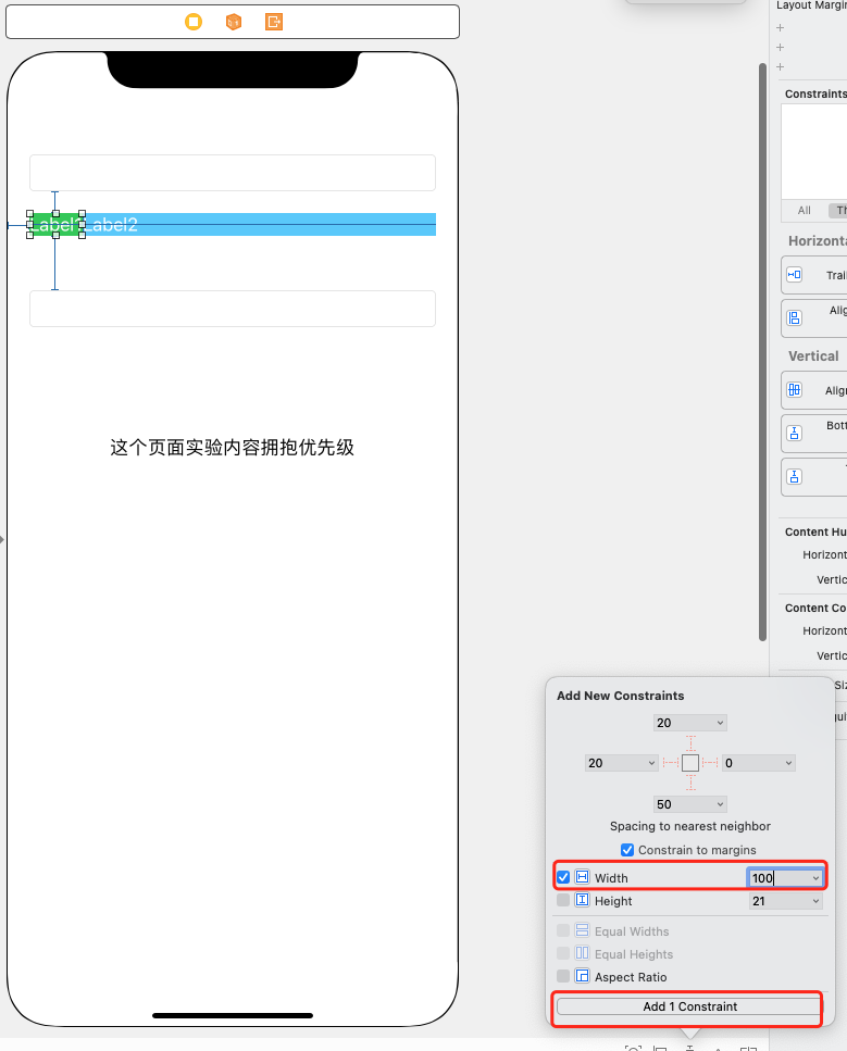 左边的label1和右边的label2,左边靠近屏幕20,右边挨着label2,上下也都有固定距离,但是没有规定宽度和高度,因为没有规定宽度高度,所以系统会报错,提示约束不确定,并且会提示你修改水平拥抱优先级.