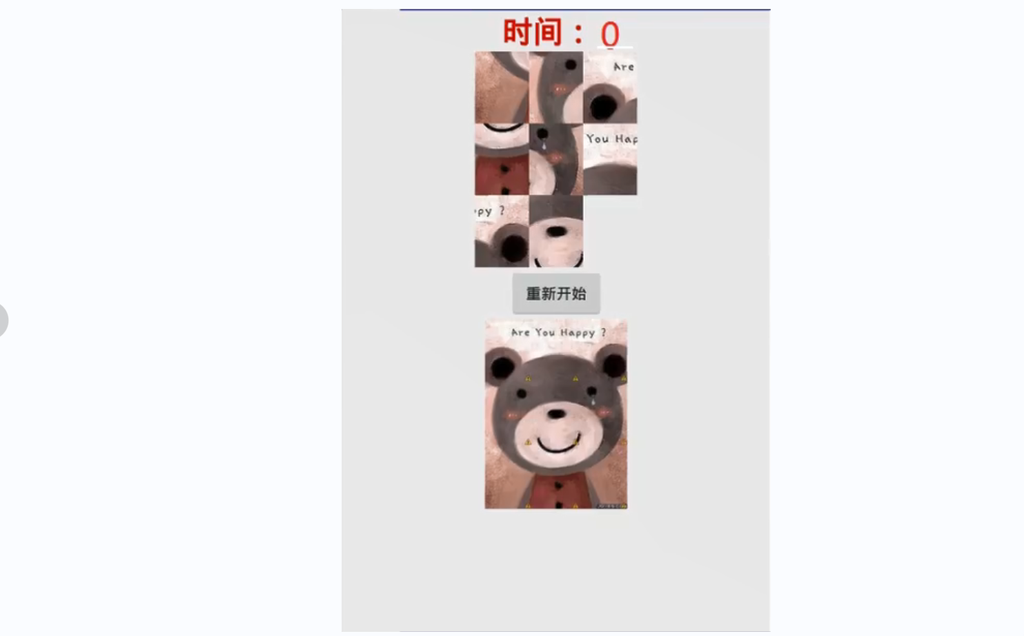 重新开始游戏后的效果:  至此,拼图游戏的所有功能已经实现完毕,我先休息下,手腕已经打酸了。如果你看到这里,我真的很欣慰,说明你是个很有耐心而且热爱Android的学生,有热情有耐心,再困难的东西都可以学会。