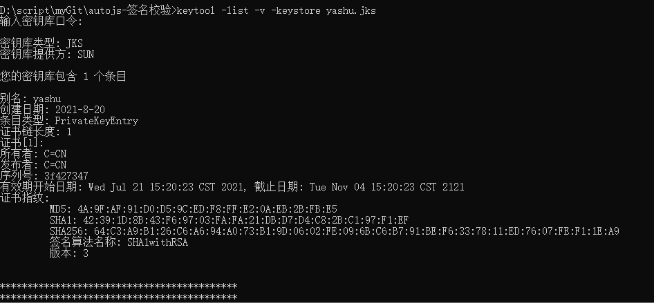 android studio 中有一个keytool, 执行以下命令即可获取签名的sha1 keytool -list -v -keystore yashu.jks
