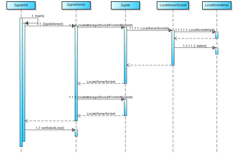 socket服务端是在ZygoteInit.main()方法中创建并初始化的,整个流程可参考上面的时序图;整个过程分为两步:一、创建LocalServerSocket,并监听/dev/socket/zygote节点;二、进入一个死循环,等待客户端发送数据。我们先看下创建LocalServerSocket的过程: