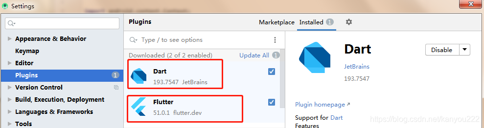 打开 AS ---> File ---> Settings, 安装如下两个插件 Dart 和 Flutter 插件